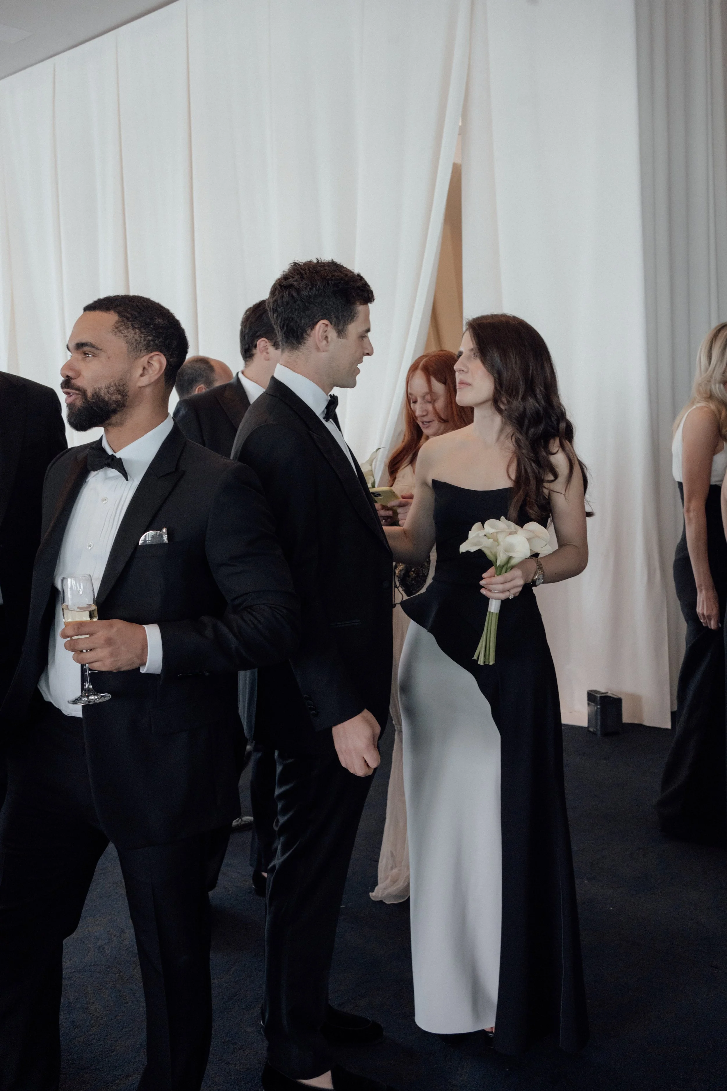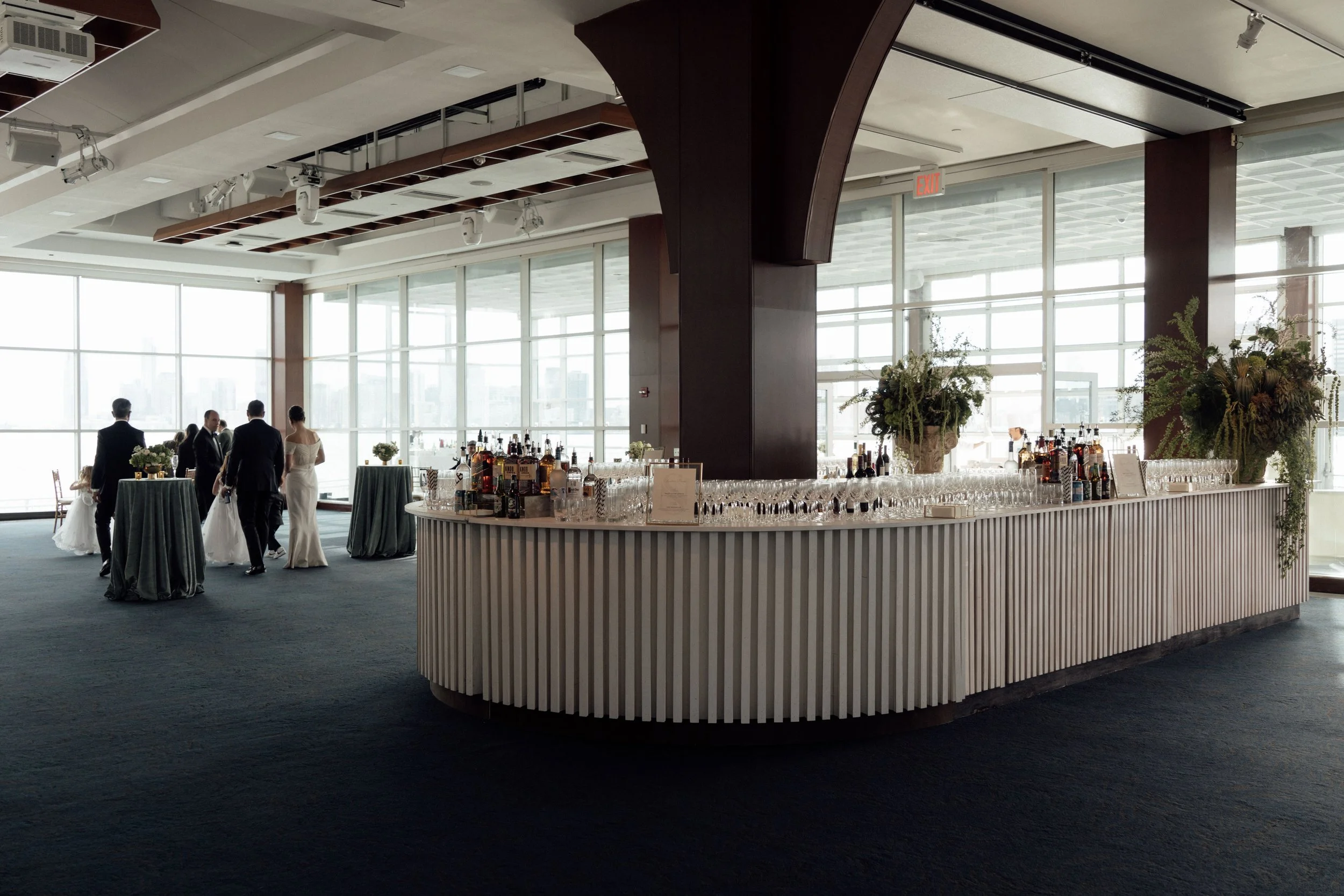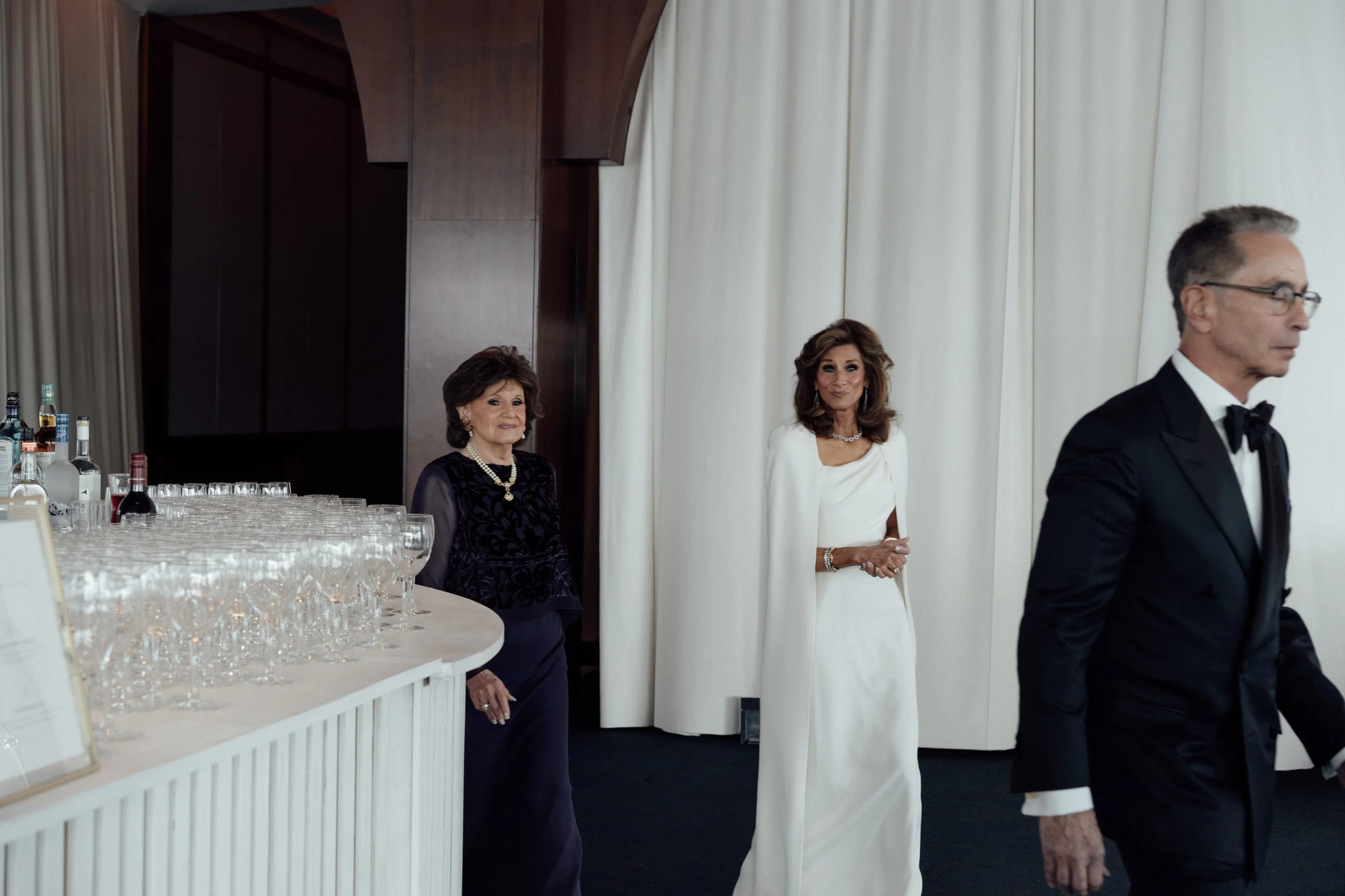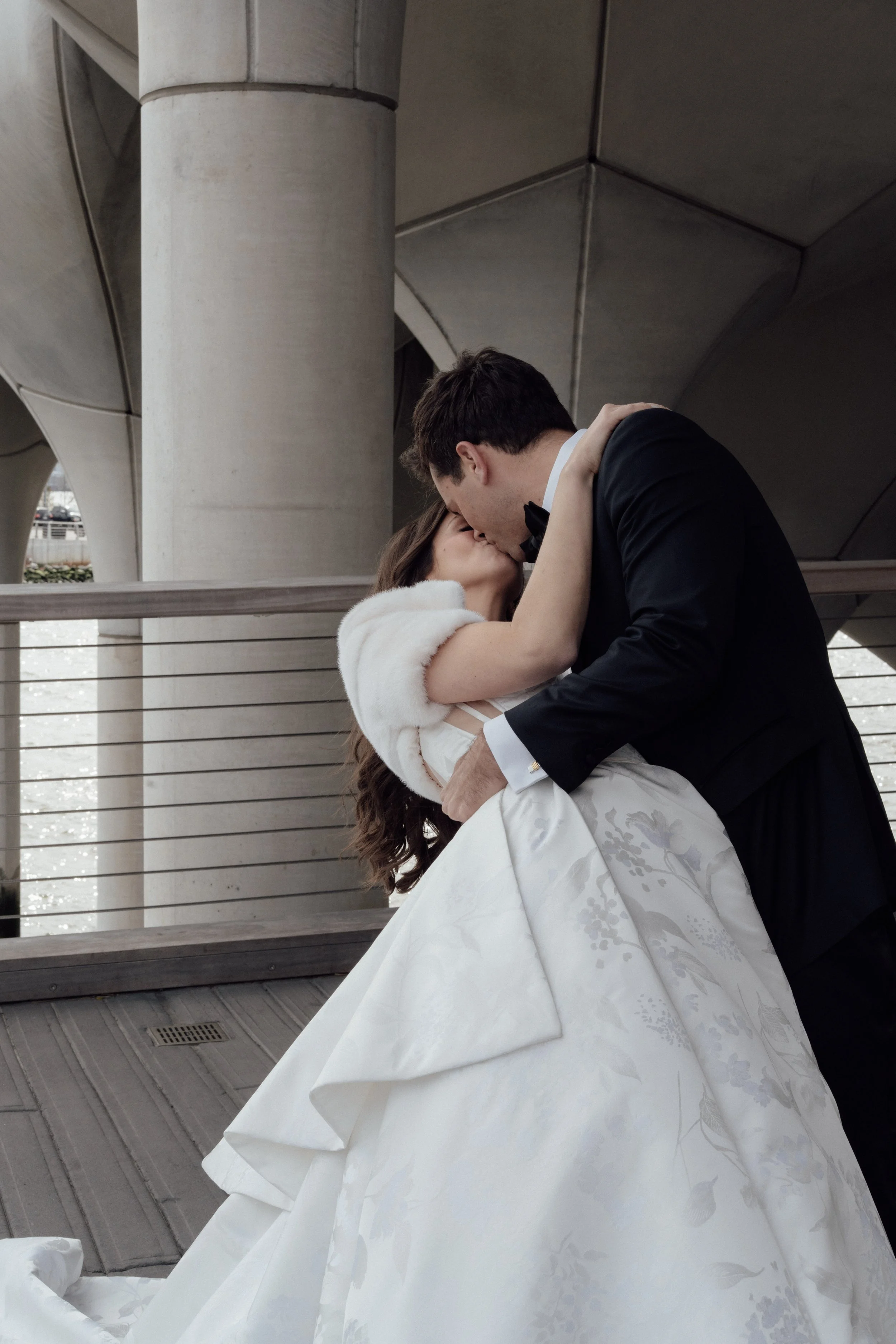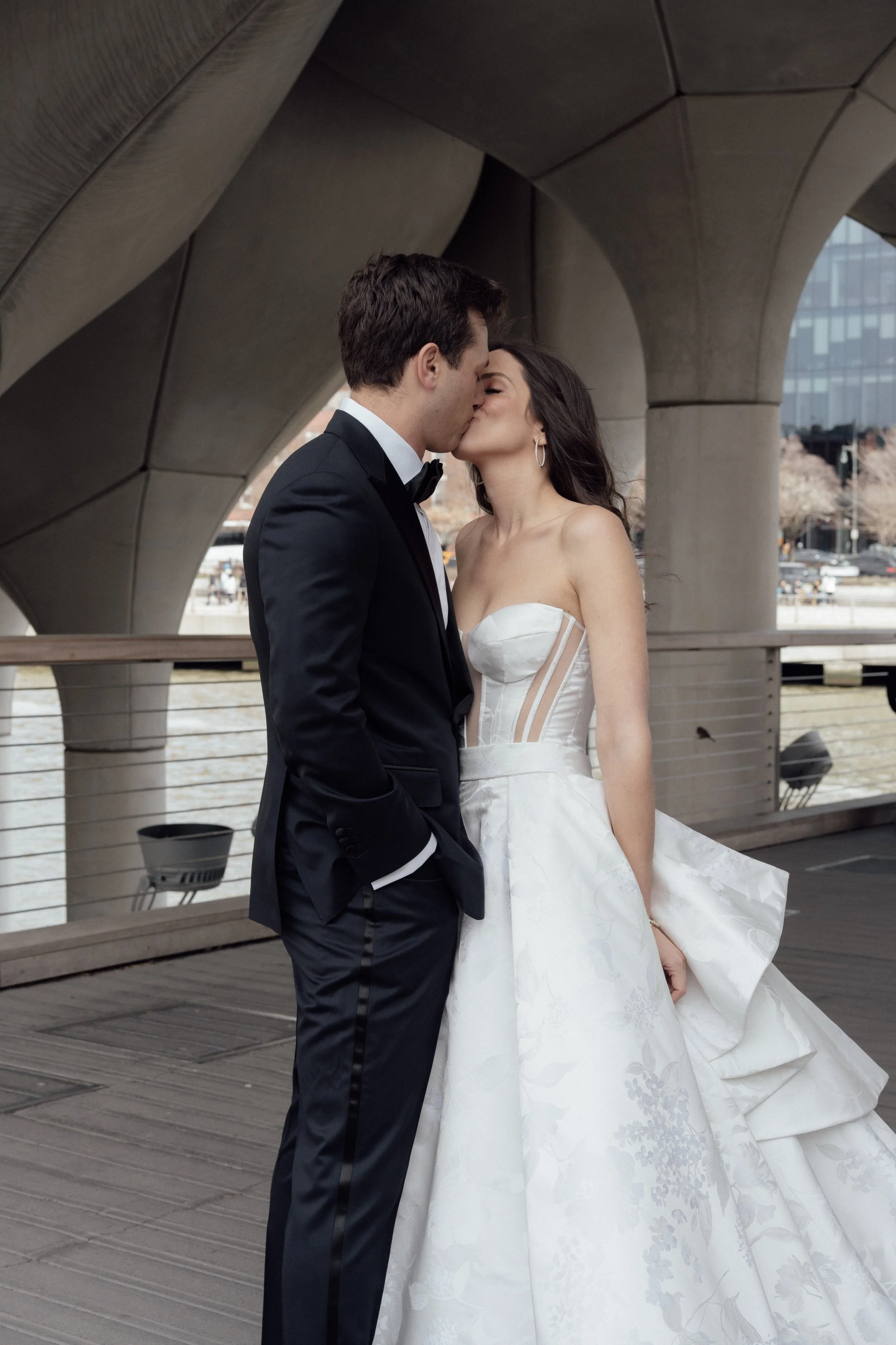 N & S began their black-tie wedding tucked inside The Bowery Hotel, where sunlight filtered through heavy drapes. As the day moved west toward the Hudson, guests gathered at Pier 60 for a modern and elegant evening with nigiri, cocktails, and the New Jersey skyline.