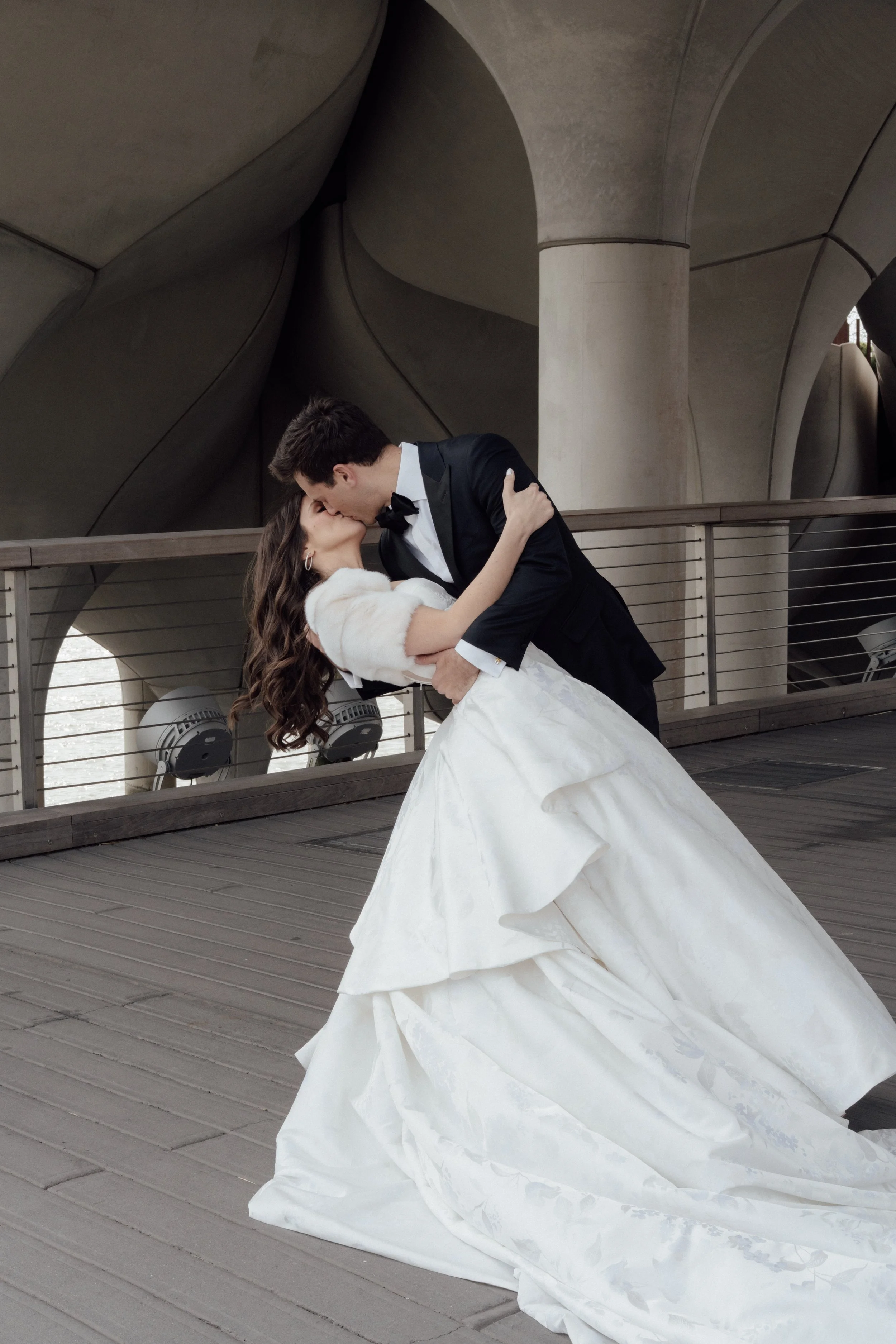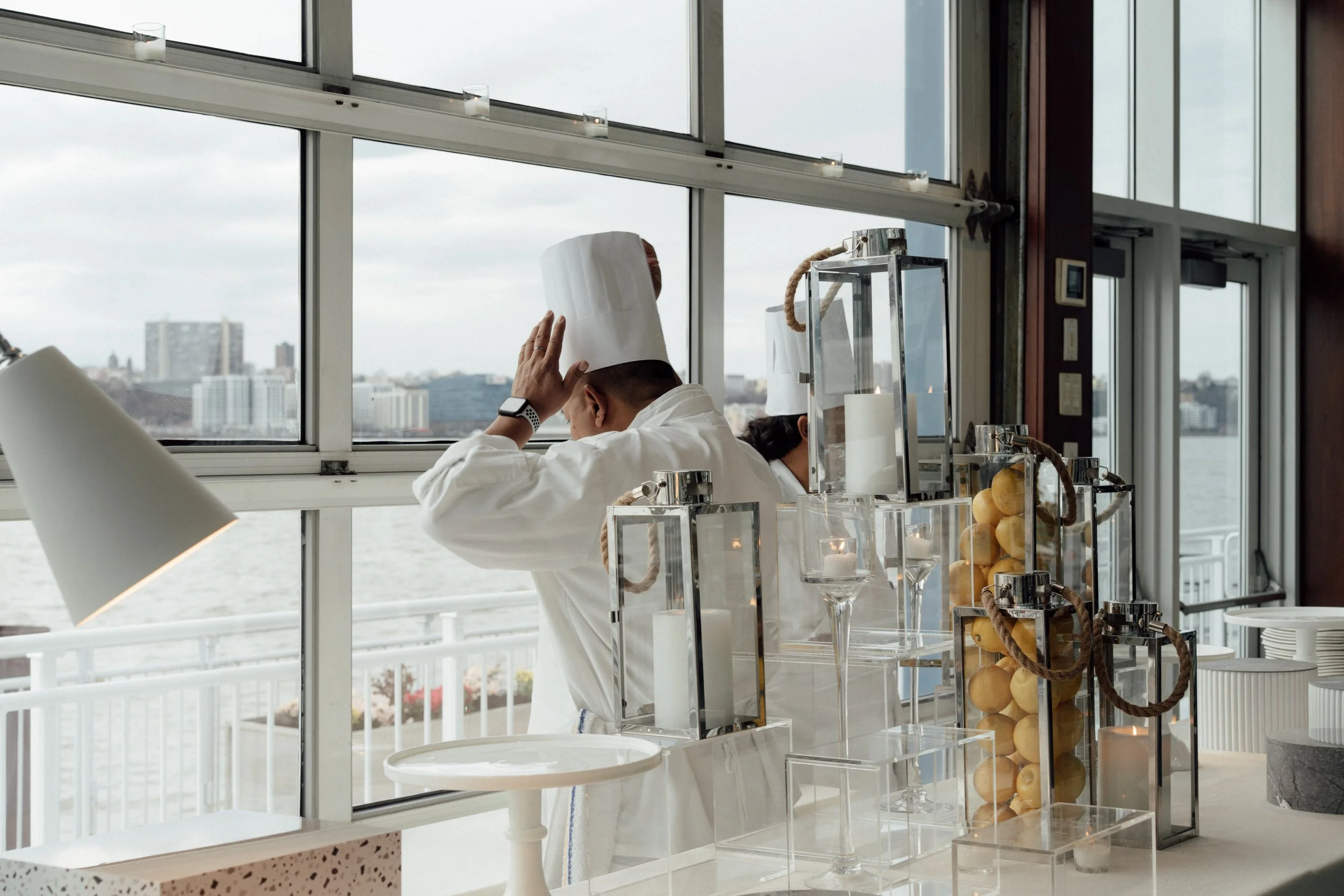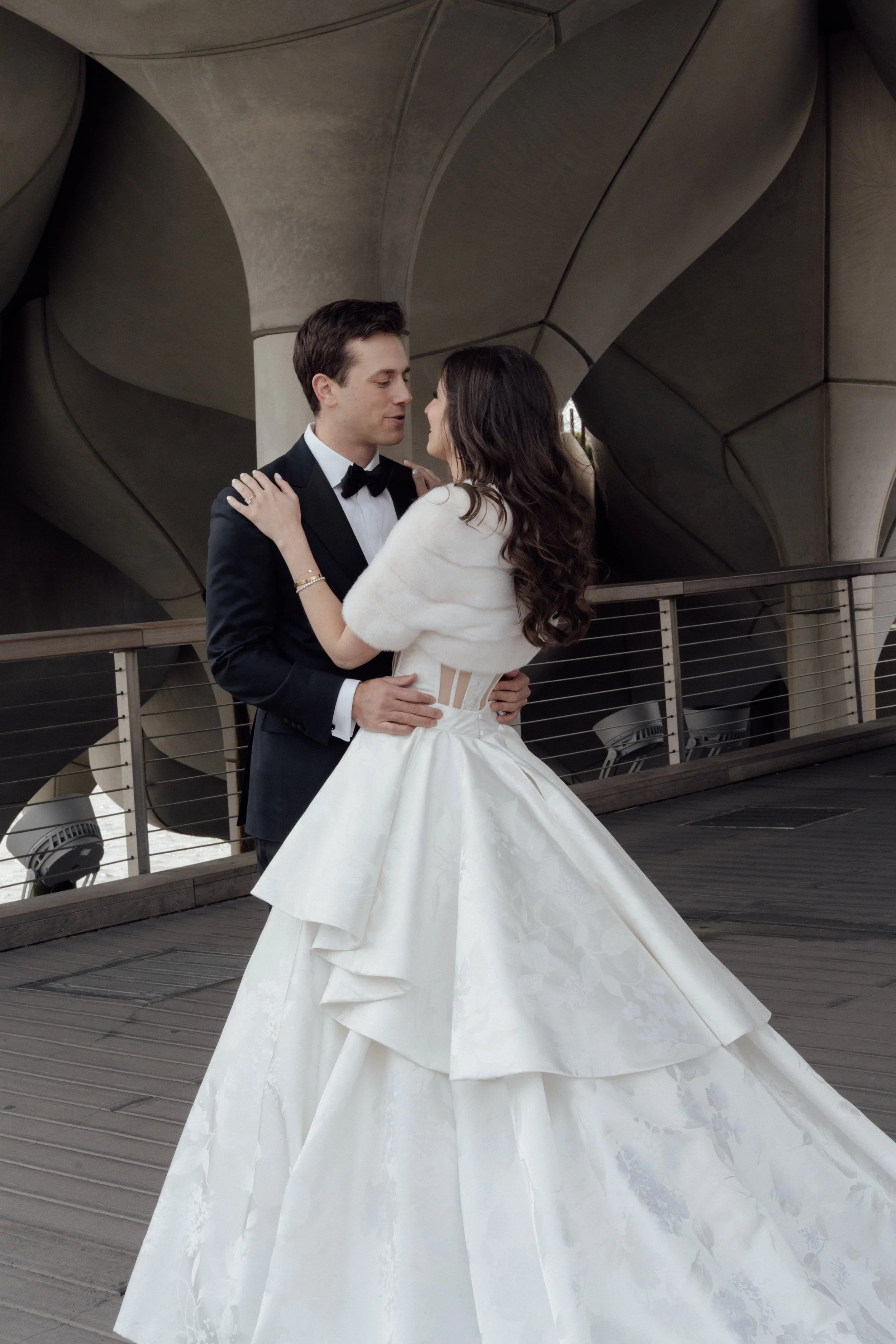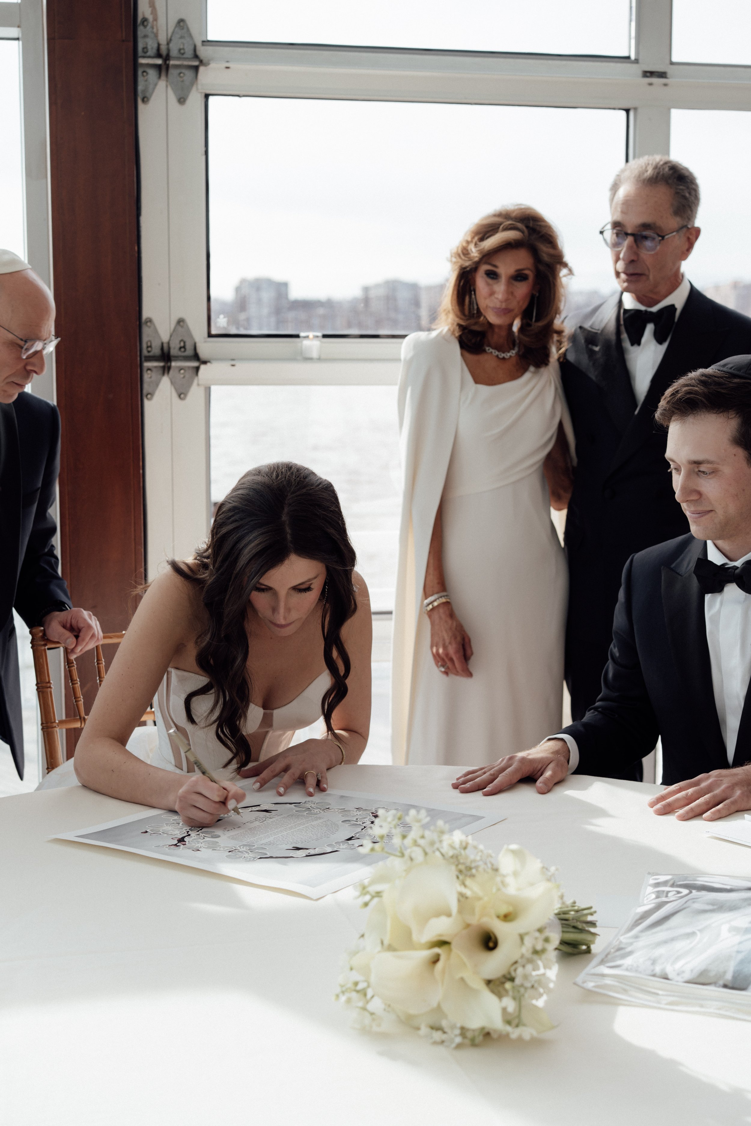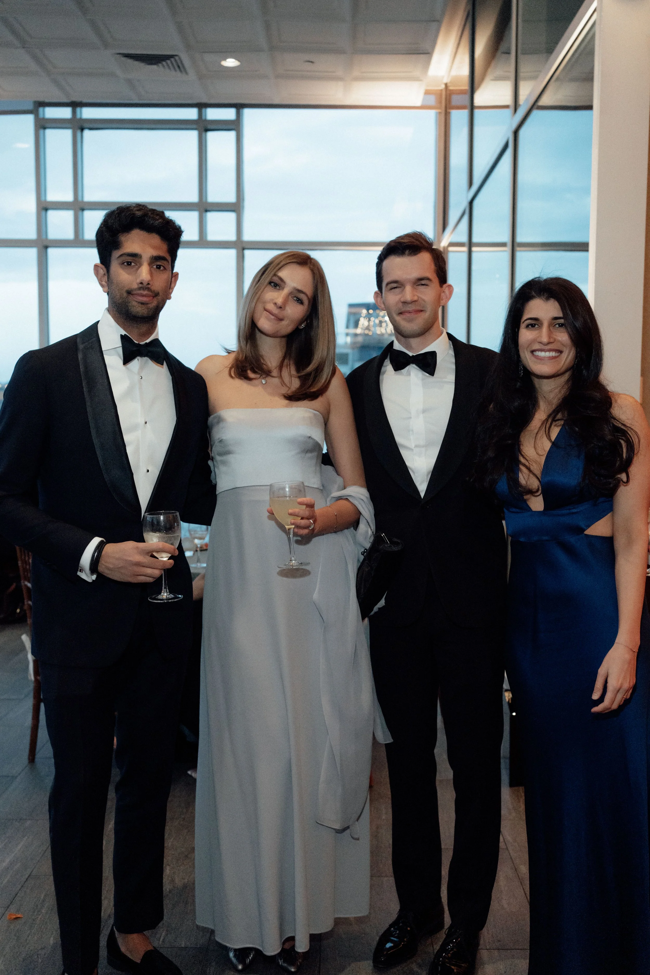 N & S began their black-tie wedding tucked inside The Bowery Hotel, where sunlight filtered through heavy drapes. As the day moved west toward the Hudson, guests gathered at Pier 60 for a modern and elegant evening with nigiri, cocktails, and the New Jersey skyline.